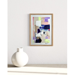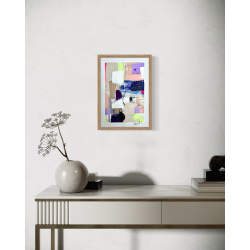 Lille farverigt maleri på fladt lærredsark til at sætte i ramme bag glas.